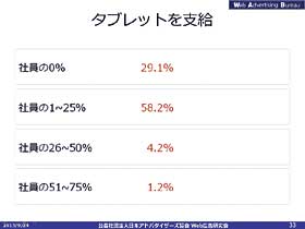 いずれも1~25%の社員に支給している企業が多く、社員の一部に配布するというトライを早くから始めている企業や、これからトライしようとする企業が多いことがわかる。また、今後のスマートフォン支給についての回答は、「増えると思う」が54.5%、「どちらとも言えない」が46.6%、「減少すると思う」が0.6%となっており、増加すると考える企業が半数以上いることもわかった。この傾向は、タブレットに関しても同様の結果となっている。