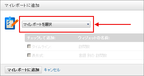 追加するウィジェットの設定画面の、左上のプルダウン(前出図2赤枠部分)をクリックすると、どのマイレポートにウィジェットを追加登録するのかをきいてくる(図3赤枠部分)。