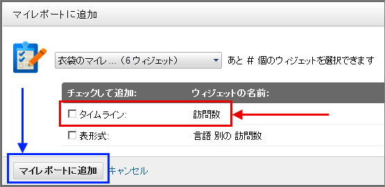 ここでは、訪問数のトレンドグラフを表示したいので、訪問数の「タイムライン」の方(図4赤枠部分)にチェックをしてから、[マイレポートに追加](図4青枠部分)をクリックする。
