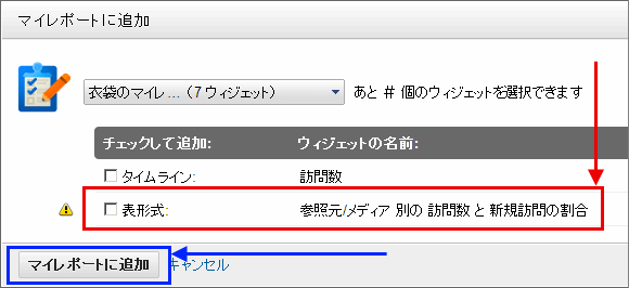 今度も1つ目は、訪問数をタイムラインで表示するウィジェットが登録候補の1つとして表示されるが、すでに図5で作成済みなので、下の「参照元/メディア別の訪問数と新規訪問の割合」を表形式で表示する方(図7赤枠部分)にチェックをして、[マイレポートに追加](図7青枠部分)をクリックする。