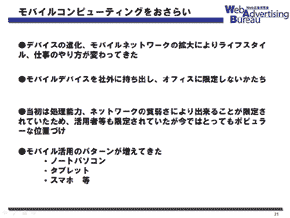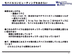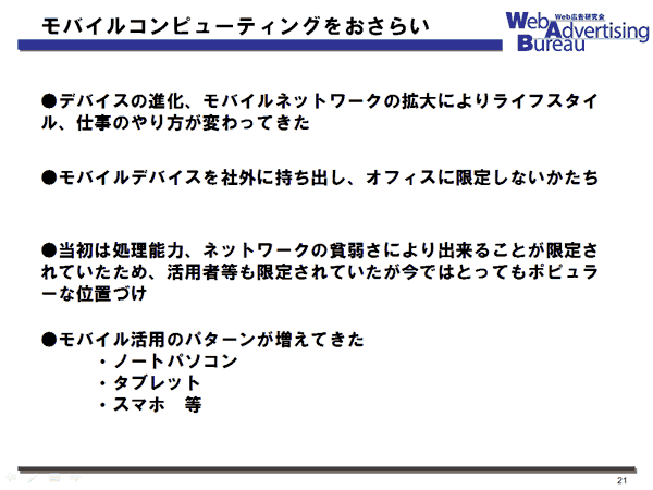 スマートデバイスへのシフトが大きく進んでいることについては、まず棗田氏がモバイルコンピューティングの歴史を解説し、次のように現状が変わってきていることを指摘した。