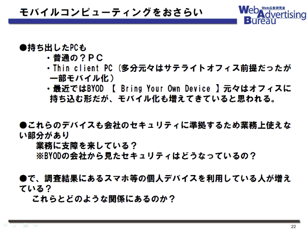 菅原氏は、2005年から5回目となる「企業内Web閲覧環境調査」の気づきとして、「閲覧制限の傾向は、調査開始以来ずっと変わらない」「スマートデバイスへのシフトが大きく進んでいる」という2点を掲げる。