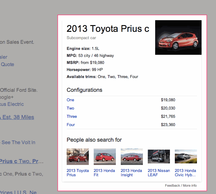 グーグルは、ナレッジグラフに自動車の情報を表示するようになった。たとえば、排気量や馬力、タイプごとの値段といった情報だ。