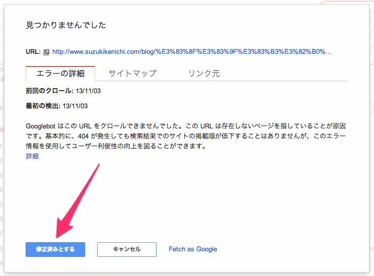 ウェブマスターツールには、Googlebotのクロール時に発生したクロールエラーをチェックできる「URLエラー」レポートがある。そして、個々のURLエラーの詳細を調べる画面に「修正済みとする」というボタンがある。