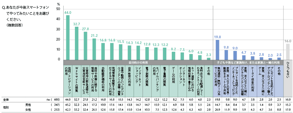 まず自分向けに利用してみたいことだが、最多回答となったのは、男女とも「地図/ナビゲーションの利用」であった。広告やCMでも目にすることの多いサービスだが、現状ではまだ使いこなせていない、もしくは利用にまで至っていないといった状況がうかがえる。使いやすい画面構成、利用方法に関するわかりやすい説明などがあれば、シニア層におけるユーザー獲得が期待できるのではないか。