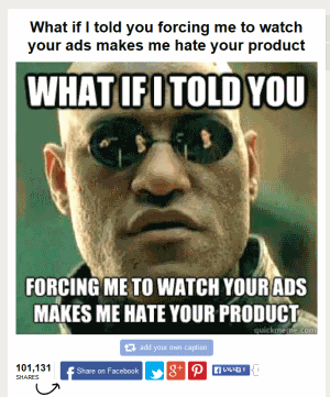 「断っておくが、広告を無理やり俺に見せたら、製品まで嫌ってやるぜ」とモーフィアスが言っている画像は、「YouTubeで広告を出す企業すべてに告ぐ」としてRedditで1600ポイント近い支持を獲得し、トップページの注目スレッドにも登場した。そのことは、多少なりともインターネットの世界における客観的事実であることの証左だろう。