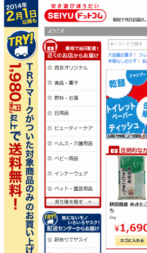 「SEIYUドットコム」はネットスーパーとネットショップを融合した統合型のネット店舗。送料が無料になるのはネットショップでの買い物金額が1980円以上の場合とする。ネットスーパーとあわせて利用する場合は、これまで通り、5000円以上で送料無料となる。