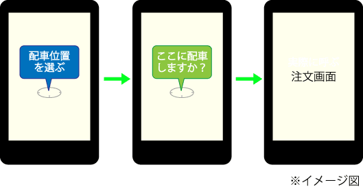 深津:森田さんの意見ベースだと、[配車位置を選ぶ]→[ここに配車しますか?]→[実際に呼ぶ]っていう3タップって感じですかね。具体的に説明すると、次のような感じですね。