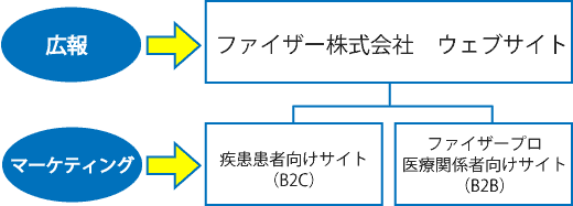 ファイザーのウェブサイトは、ファイザー株式会社のコーポレートサイトを広報部門が担当し、上記で説明したような疾患患者へ向けたB2Cサイトとファイザープロと呼ばれる医療関係者向けのB2Bサイトをマーケティング部門が担当しています。