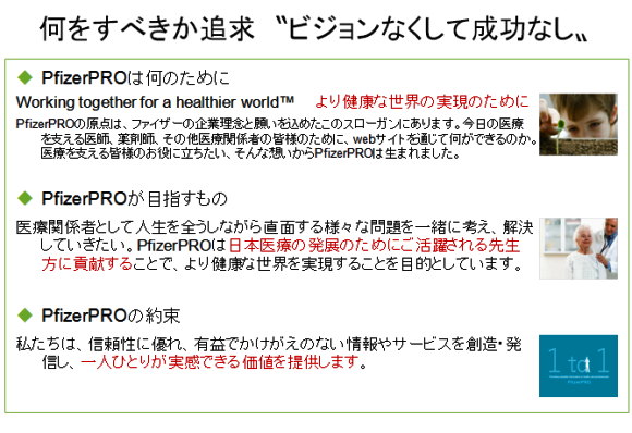 こうしたなかで最終的に経営陣を意思決定に踏み切らせたのはファイザープロの目指すビジョンとその背景にあるファイザーのスローガンだったと柿本さんはいいます。