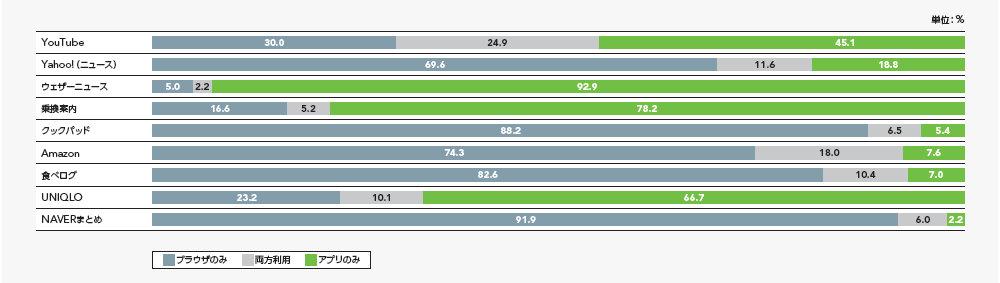 もうひとつ、「Amazon」と「UNIQLO」というEC系サービスについて着目してみると、「Amazon」がWebサイト、「UNIQLO」がアプリにそれぞれ利用が偏っている。この点について考察すると、「Amazon」の場合は前述の「クックパッド」等と同様に、購入したい商品を検索した際に、「Amazon」内で扱っている商品ページが検索結果として表示される、すなわち各商品Webページが検索結果のランディングページとして表示されるケースが多い、ということが要因となっているのではと考えられる。