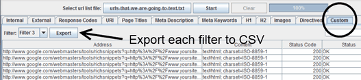 クロールが終了したら、[Custom]タブに進み、テストした各フィルタを選択して、結果をエクスポートする。