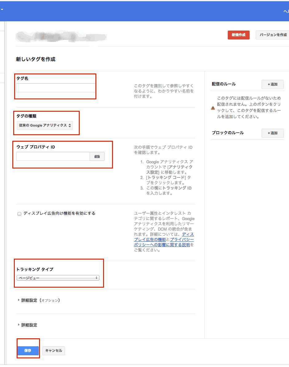 ①新規タグの作成で、Googleアナリティクスのシンプルなタグを作成します。