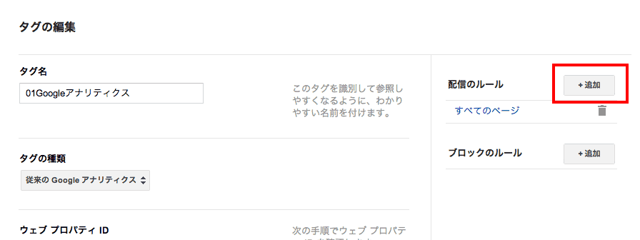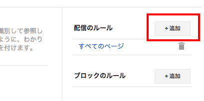 ②新規タグ作成が完了したら、再度そのタグをクリックし、右側にある配信ルールの[+追加]を押します。