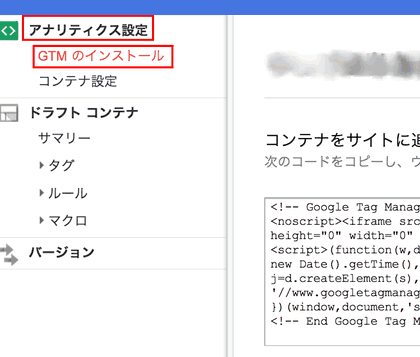 ①[アナリティクス設定]>[GTMのインストール]を選び、タグを取得します。
