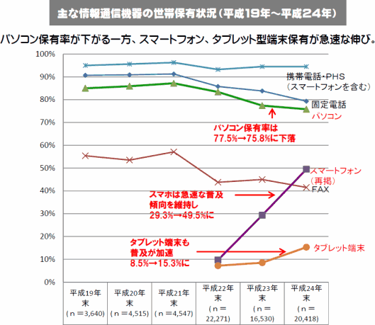 2013年6月に総務省が発表した通信利用動向調査の結果によれば、スマートフォンの普及率は半数に到達しています。年々急激に普及率を伸ばしているスマートフォンに対し、パソコンの普及率は2009年をピークに低下し始めています(図1)。