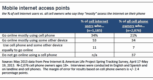 米国の調査機関Pew Internetが2013年9月に発表した米国人のスマートフォン利用に関する調査結果によれば、デスクトップパソコンなど、他のデバイスを所有していても、ほとんどの場合スマートフォンでWebアクセスすると答えたユーザーが34%いました(主にスマートフォン以外でWebアクセスすると答えたのは53%)。常に手元にあり、起動を待つ必要がないスマートフォンの利用頻度の高さは、日本でもさほど変わりないでしょう。