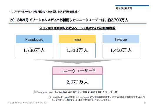いつでもどこでもWebにアクセスできるようになったことから、Webサイトの使い方やニーズも変わり始めています。野村総合研究所が2013年1月に発表したソーシャルメディア利用実態によれば、日本国内には2,600万人以上のソーシャルメディアユーザーがいるということです(図4)。