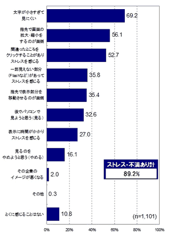 こうした現状は、89.2% のスマートフォンユーザーがスマートフォン向けサイトにストレスを感じているという声に反映されています。利用者がスマートフォンを使って手軽に情報を得たいと思っても、スマートフォン向けサイトが「サブサイト」のような扱いを受けているのであれば、不満を感じながらパソコン向けのサイトを使わざるを得ないわけです。