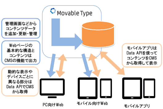 今後のMovable Typeを期待させてくれる注目の機能が Data API です。Data APIは新バージョンの目玉の1つで、Movable Typeで管理しているコンテンツを、CMSのページ生成テンプレートを介さずにデータとして利用できるようにする機能です(REST/JSON方式)。言い換えれば「Movable Typeのページ管理を使わずに、Movable Typeで管理しているコンテンツデータを活用する」ようなものです。