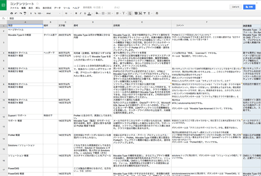 まず、Webサイトに掲載されているすべてのコンテンツをスプレッドシートに書き出しました。