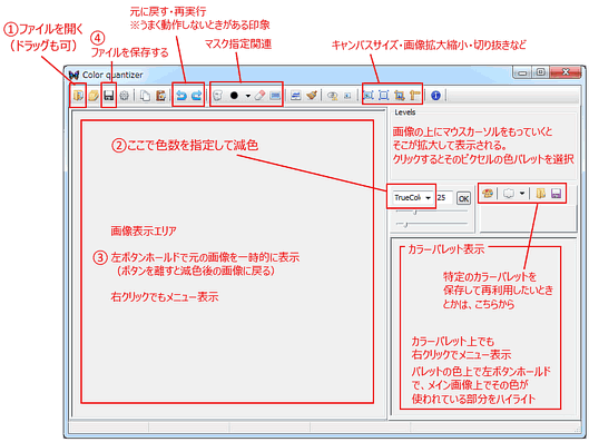何がわかりやすいって、減色後に画像をマウスボタンでホールド(押して離さない)すると、元の画像が表示されること。つまり、画像の上でマウスボタンをカチカチすると、減色後と元とを比較できるのです。この方法は、横に並べて表示するよりもわかりやすいです。