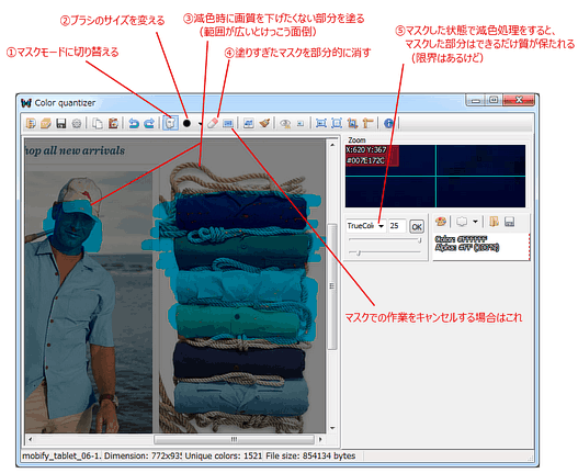 ふつうに色数を落として微妙な感じになる場合、「ここは減色処理を抑える」ようにマスク指定できます。