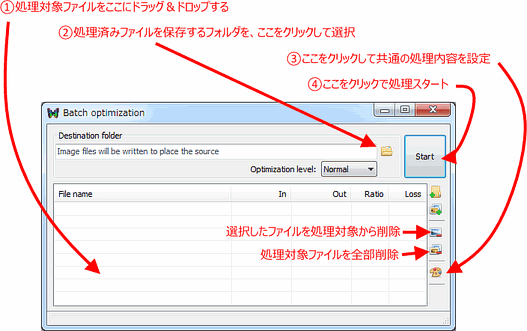 - 減色処理だけでなく、メタデータの削除などファイルサイズ軽量化の処理もやってくれる。