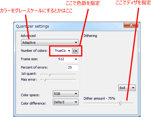 減色処理は、色数をドロップダウンリストから選んだら自動で反映されますが、色数を数値で入力したりその他のパラメータ(% errとか)をいじったりしたときは[OK]ボタンを押さないと反映されない模様です(カラーパレットの表示状態で確認できます)。