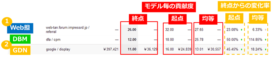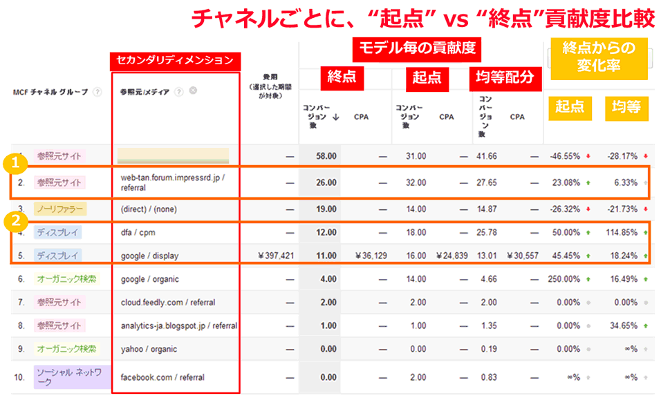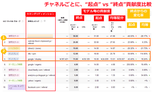 すべてのチャネルをまたいでアトリビューションを分析する場合、どのモデルにおいても、参照元としてWeb担当者Forumのサイトが強いと判定できる。