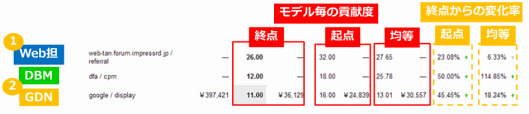 ディスプレイ広告まで含めたチャネル全体のアトリビューション評価を一覧比較できるようになることで、媒体特性や、チャネルごとのプロモーションの強弱のつけ方が見えてくる。