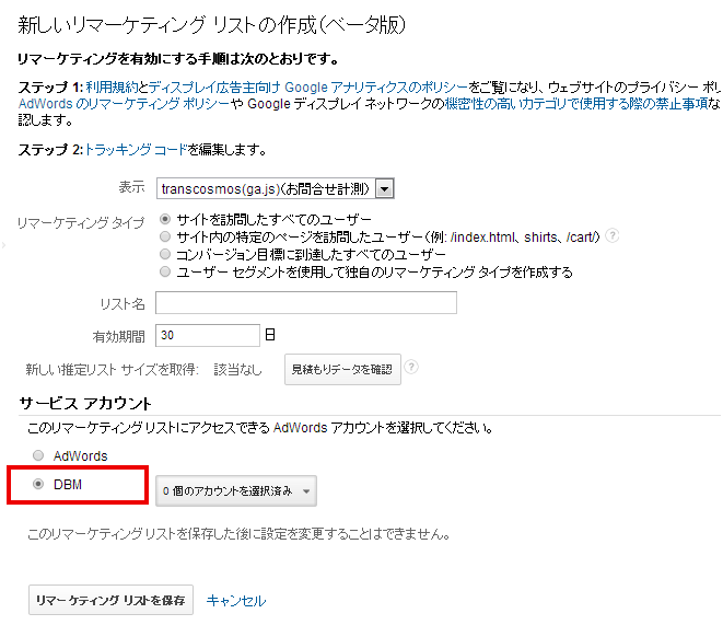 上記1から3はすでにGA上でセグメント化してあるリストをDBMまたはアドワーズへリマーケティングリストとして共有するものだ。