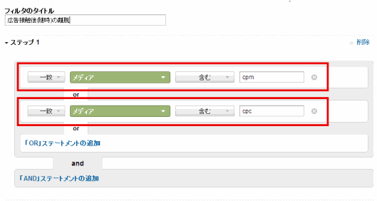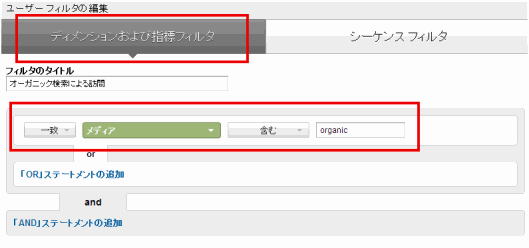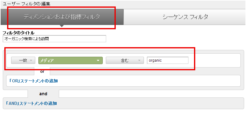 このセグメントに関しては、「ディメンションおよび指標フィルタ」で設定できる。