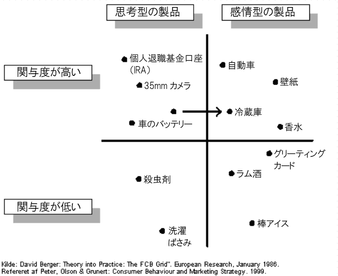 たとえば、低関与・高関与の「関与度」と、指向型・感情型の「製品タイプ」の2軸で考える「FCBグリッド」(リチャード・ヴォーン氏が開発したものだ)の利用が有効だ。