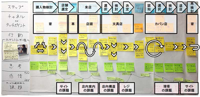 最後に、ブレストが終わったらスマートフォンでも携帯でもいいので写真を取り、そのデータをパソコンに取り込みパワーポイントなどに貼り付けよう。そして、その付箋ブレスト写真の上から、「ステップ」「チャネル/タッチポイント」「課題」などの分類を書き込む。