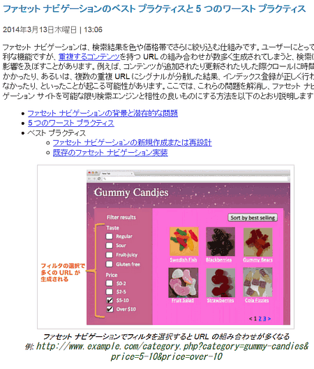 1か月前に取り上げた、英語版のグーグルウェブマスター向け公式ブログが公開した「ファセットナビゲーションのベストプラクティス」の、日本語訳が出た。
