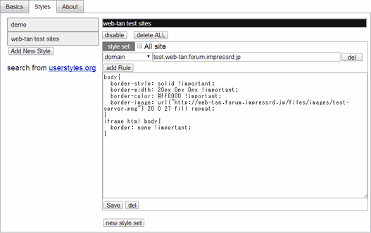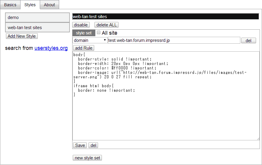 @-moz-document domain("テストサイトのドメイン名") {