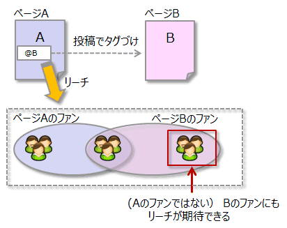 他Facebookページを投稿にタグ付けすると、タグ付けをしたページのファンにもリーチする可能性があります。たとえば、Aというページの投稿にBというページをタグ付けした場合、該当の投稿がページBのファンへのリーチにつながり得るということです。