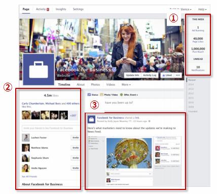 - 右カラム ―― ユーザーのタイムライン同様、自社の投稿が1カラムで表示されます。新ニュースフィードのデザイン同様、画像が大きく表示されます(3)。