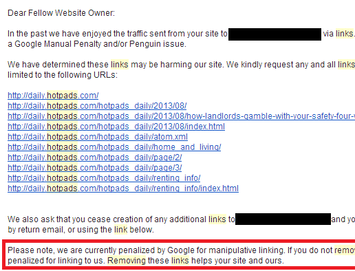 当サイト××はこれまで、貴サイトからのリンクを通じてトラフィックをいただいてきました。しかし残念なことに、当サイトは現在、グーグルによる手動ペナルティやペンギンアップデートのあおりを受けたのか、トラフィックが大幅に減少しております。