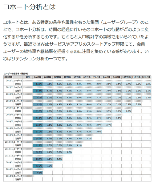この機能は、簡単に言うと「特定の期間に初めて訪れた人がその後どのような行動をとっているか」を追跡できる機能だ。たとえば、2014年1月に初めて訪問したユーザーのうちどのくらいが今も引き続き訪問しているかを知ることができる。