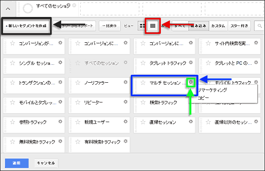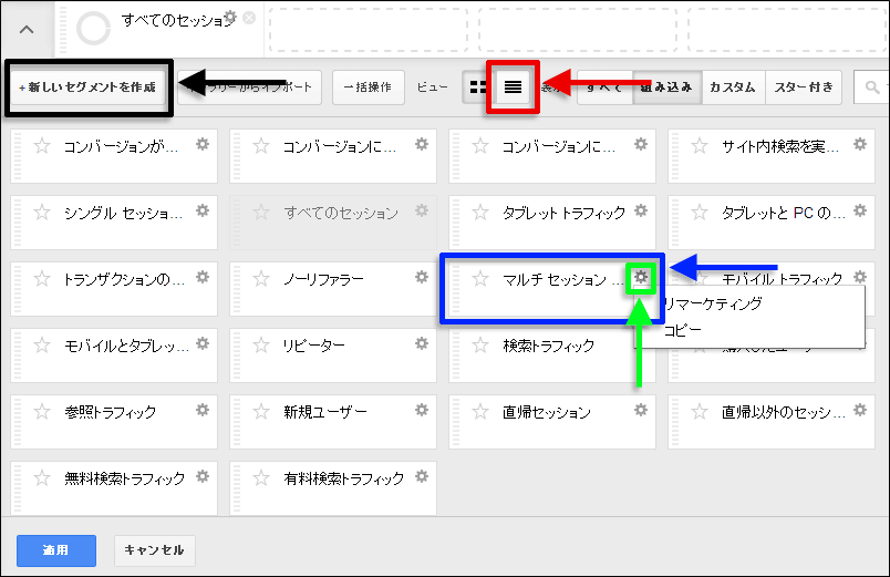 - 標準で用意されているセグメントの一覧から「マルチ セッション ユーザー」セグメントをクリックする