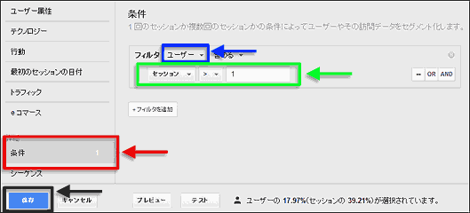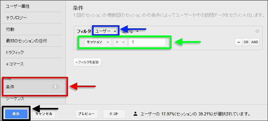 - セグメント名を「5セッション以上あったユーザー」と入力する