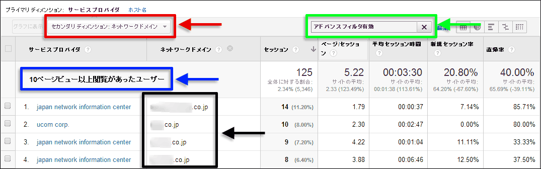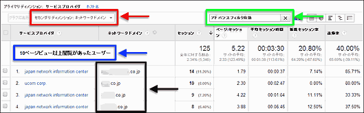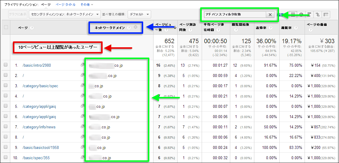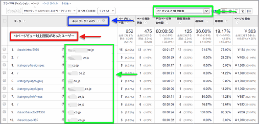 見るレポートは、[行動]>[サイト コンテンツ]>[すべてのページ]で、これにまず「10ページビュー以上閲覧があったユーザー」セグメントを掛ける(図8赤枠部分)。続いてセカンダリ ディメンションでネットワーク ドメインを選択(図8青枠部分)し、さらにそのネットワーク ドメインで、**.co.jpという企業ドメインに絞り込む(図8緑枠部分)。出力結果が図8だ。
