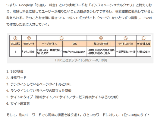 こちらの記事では、検索結果と検索結果に出てくるページを分析し、この2つを実現するためのヒントを得る方法を説明している。