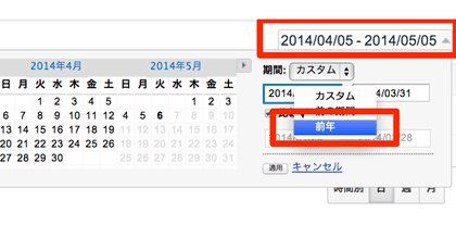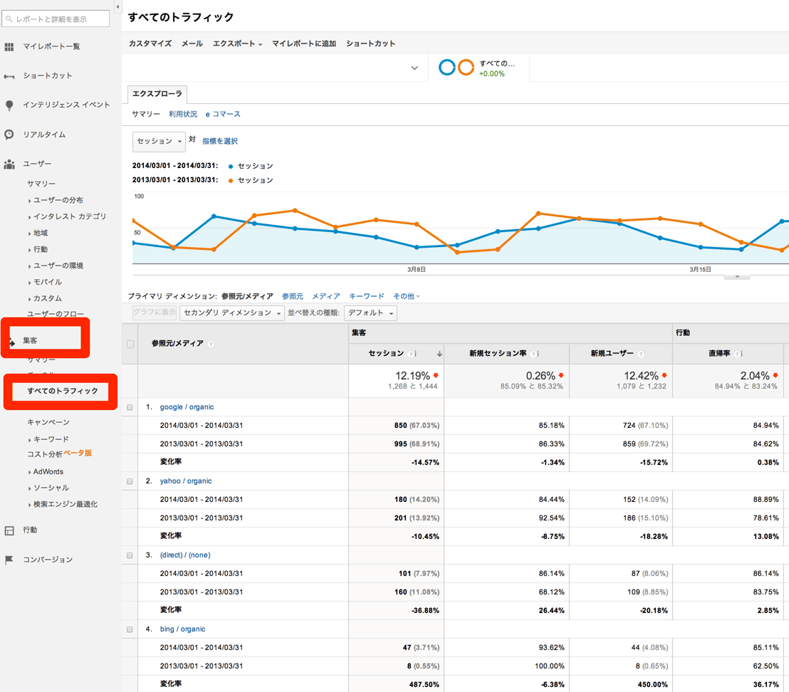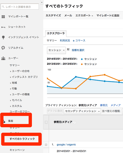 まずはよく出てくる期間比較。これは、必ず前年同時期と比べてみよう。一発で簡単にできるし、特に[集客]>[すべてのトラフィック]などではおもしろいデータを見ることができる。
