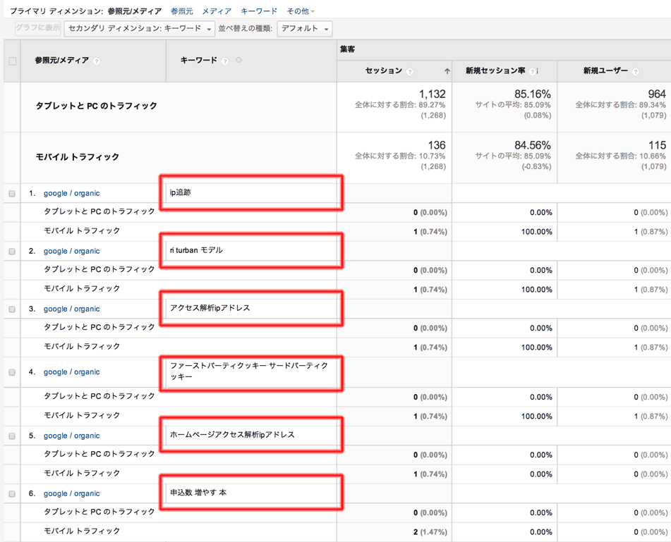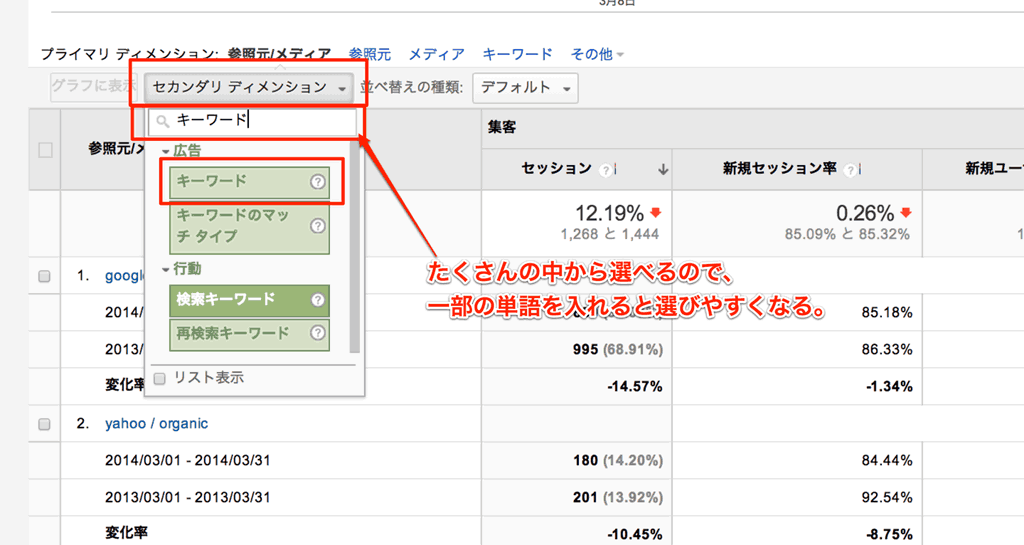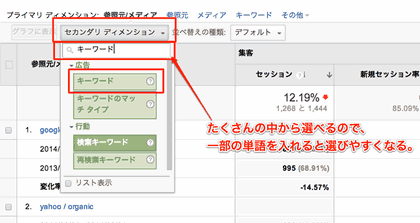 じゃあ理由を考えてみよう。なぜかを知りたい場合は「セカンダリディメンション」だ。名前は難しいけど、やってみると簡単。やってみよう。ただし、Googleは昨年末よりキーワードをnot providedで提供しなくなったのでそこは注意してほしい。