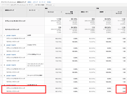 PCよりスマホのほうがセッション/訪問(平均ページビュー)の長いものがありますね。電車内などで調べ物をしているのかもしれないですね。