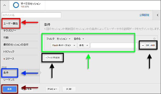 「条件」は、自由にディメンションや指標を選択して条件を記述(図3緑枠部分)し、それらを組み合わせ(図3黒枠部分)たりすることで指定していく。