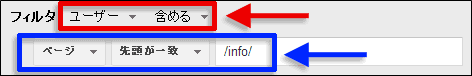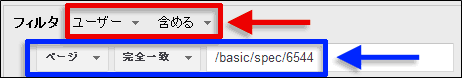ディメンションや指標を選択して条件を記述する部分は、どちらも指標は「ページ」を選択し、特定のディレクトリ配下を指定する場合は「先頭が一致」、特定のページを指定する場合は「完全一致」を合致条件から選択し、ディレクトリやページを個々に記述する(図4青枠部分、図5青枠部分)。